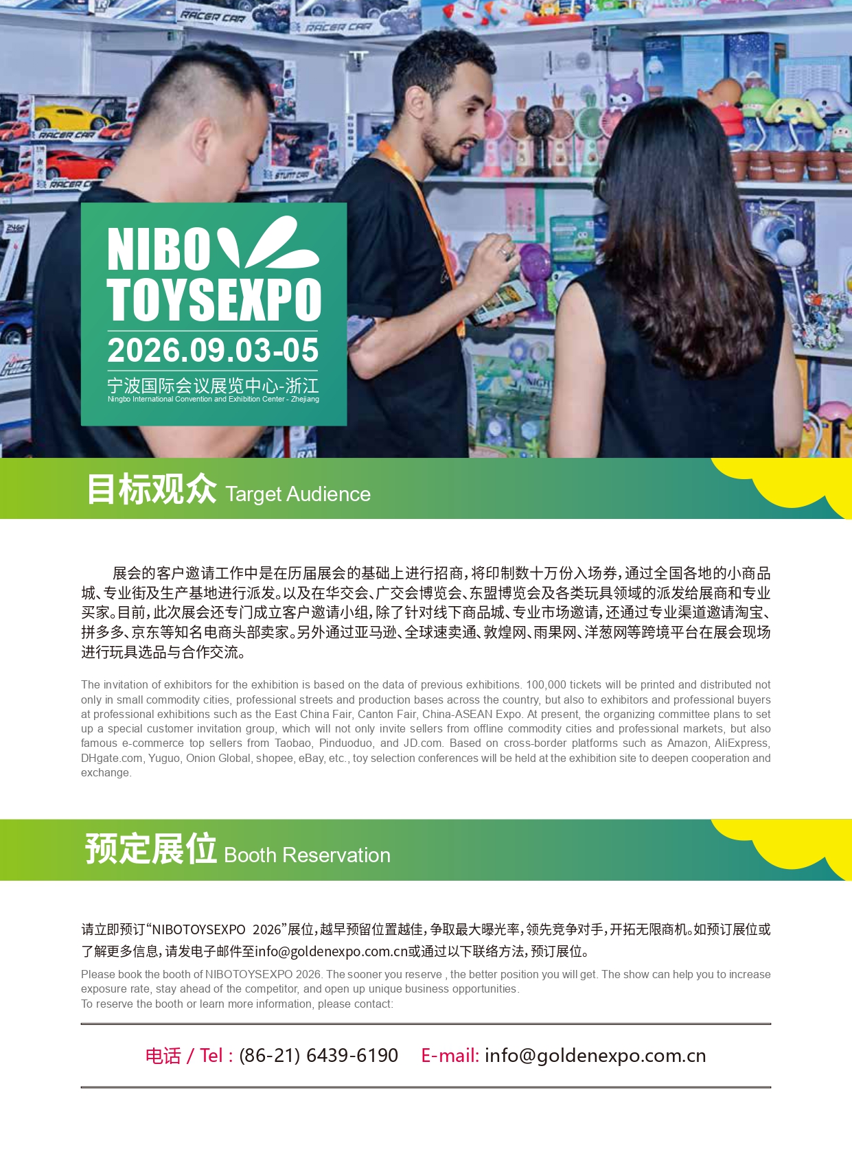 为更好的助推我国玩具外贸出海与行业交流,由中国商业联合会主办,广州玩具和礼品行业协会与玩 具巴巴网支持,中泓展览(宁波)有限公司具体承办,定于2026年09月03-05日在浙江-宁波国际会议展览中 心召开“2026宁波国际玩具与潮玩展览会”。展会以“宁波玩具展聚势出海、链接全球”为宗旨,全面依托宁 波“制造业大市”与独特外贸出口优势,汇聚更多的玩具、童车与婴童用品产区行业机构、生产企业、外贸公 司、跨境平台,以及海外相关机构前来参展参会。届时,大家欢聚一堂共谋玩具出口良策,破解产业发展难题 ,以促进中国玩具产品外贸出海与产业高质量发展。